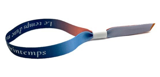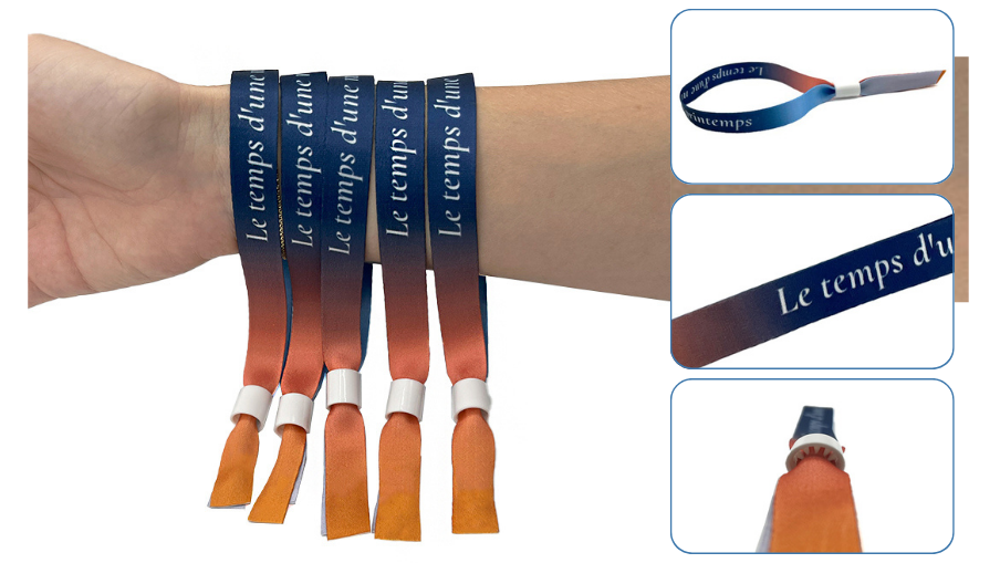 Um den Anforderungen unseres Kunden gerecht zu werden, begannen wir die Herstellung dieses Armbänder mit der Wahl eines glatten Satins aus Polyester – ein Material, das dem Produkt ein raffiniertes und leichtes Erscheinungsbild verleiht, perfekt im Einklang mit dem Markenimage dieses Hauses. Diese Auswahl, kombiniert mit der Qualität unserer Sublimationsdruck-Personalisierungen, ermöglicht klare, leuchtende Farben sowie eine saubere, präzise und perfekt lesbare Schrift.