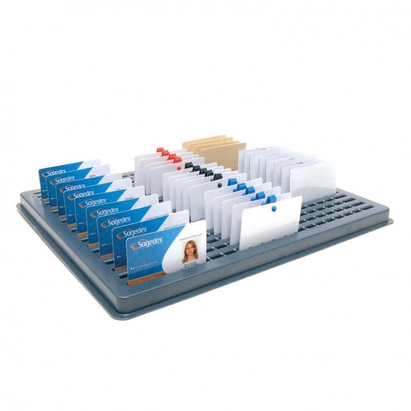 Mit seiner Nutzfläche von 384 mm x 304 mm kann der Organizer bis zu 76 Ausweise in Kreditkartenformat und Konferenzausweise aufnehmen. Dieser Organizer wird aus schwarzem thermogeformten PVC hergestellt mit einem abnehmbaren Kristalldeckel und wird in einer starren Kartonkiste geliefert.