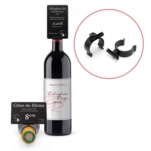 Eleganter, kippbarer Etikettenhalter, der sich an alle Arten von Flaschenhälsen anpassen lässt. Ideal für Caterer und Weinhändler, hebt er Ihre Produkte hervor.