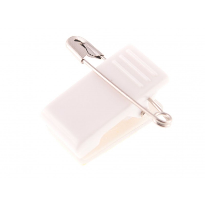Klebeclips mit Kunststoffklemme und Sicherheitsnadel: praktische Lösung zum einfachen Befestigen und Halten, ideal für verschiedene berufliche Zwecke.