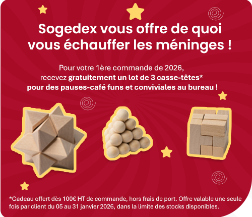 Pour célébrer 2026 en beauté, Sogedex vous offre un lot de 3 casse-têtes pour toute commande de plus de 100€ HT. Un petit objet malin pour animer les pauses-café, challenger vos collègues ou simplement faire travailler vos méninges entre deux projets.